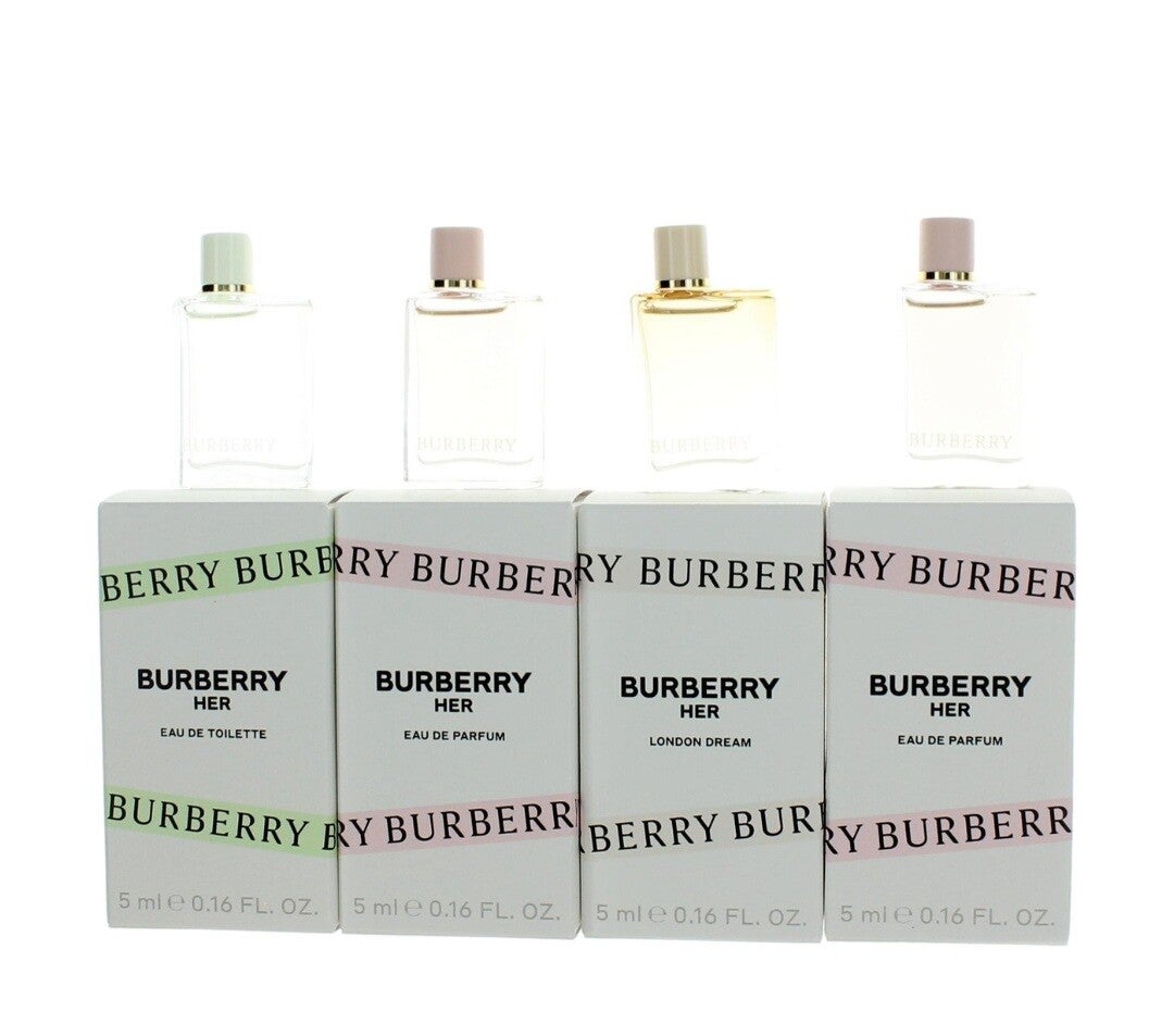 This set contains London Dream Eau De Toilette, 2x Burberry Her Eau de Parfum, and Burberry Her Eau De Toilette. All are .16 oz splashes.